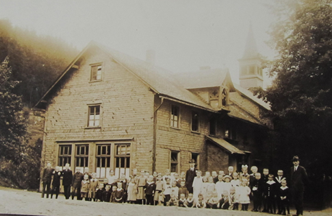 Die Parallelen zwischen Schule und Kirche sind offensichtlich. Sowohl die Schule als auch die Kirche wurden als Gebäudeeinheit gebaut und auch im Abstand von wenigen Wochen 1860 eingeweiht. Zuvor waren Kirche und Schule über lange Jahre hinweg provisorisch in Zimmern des herrschaftlichen Hofgebäudes (Forstamt Schwarzenau) untergebracht. Das war die untere „ständige“ Schule (1801: Lehrer Johannes Keller), wobei es aber auch eine „unständige“ obere Schule gegeben hat, deren Standort aber unbekannt ist. Vermutlich handelte es sich hierbei um eine Stube des Lehrers (1801: Unständiger Lehrer Johannes Richstein). Möglicherweise war die obere Schule auch früher im „Hüttental“ und von den Separatisten gegründet worden.